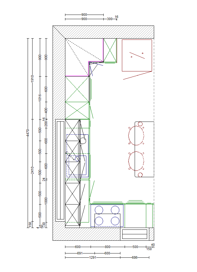 A tervezendő, cső alakú 447 x 209 cm méretű konyha helyiség a kivitelezés azon fázisában volt a tervezés megkezdésekor, amely az ügyfél által elképzelt optimális elrendezésre épült. Elektromos- és víz kiállások, elektromos porszívó rendszer fogadó nyílása már kialakításra kerültek, burkolás és festés már elkészült, így tervezési rugalmasságunk nagyon csekély volt. A tároló kapacitás növelését gátolta a hosszú ablakos falban megbújó szellőző rendszer, mely a 4 méteres belmagasság ellenére a torony szekrények magasságában futott.