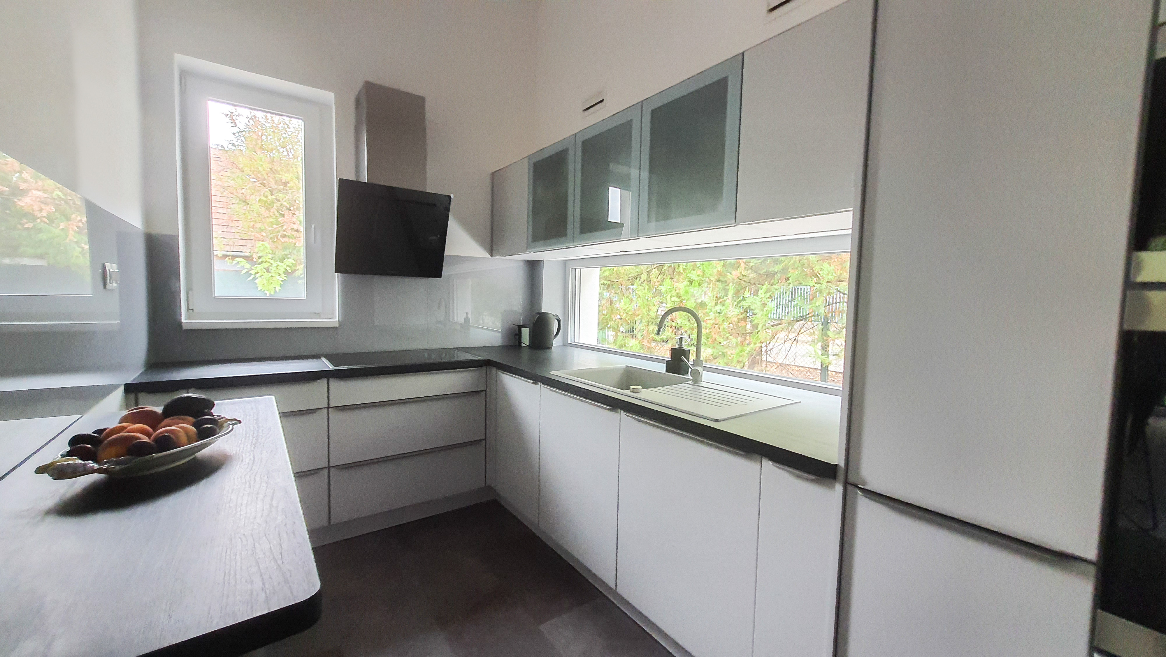 A zárt, dobozhatás elkerülése érdekében javaslatunk, miszerint a felső elemek nagyobb arányban legyenek alsó-felső világítással ellátott tejüveges frontok, elnyerte ügyfelünk tetszését. Az eleganciát tovább fokozta az élre ültetett, íves, rozsdamentes acél színű fogantyúk használata, a galambszürke üveg falburkolat, illetve a padló színével harmonizáló fa textúrájú sötét szürkésfekete munkalap.