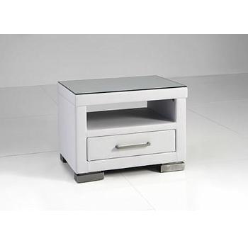 Pago fiókos éjjeliszekrény, üveg tetőlappal, fehér textilbőr, 56x40x40 cm "k"