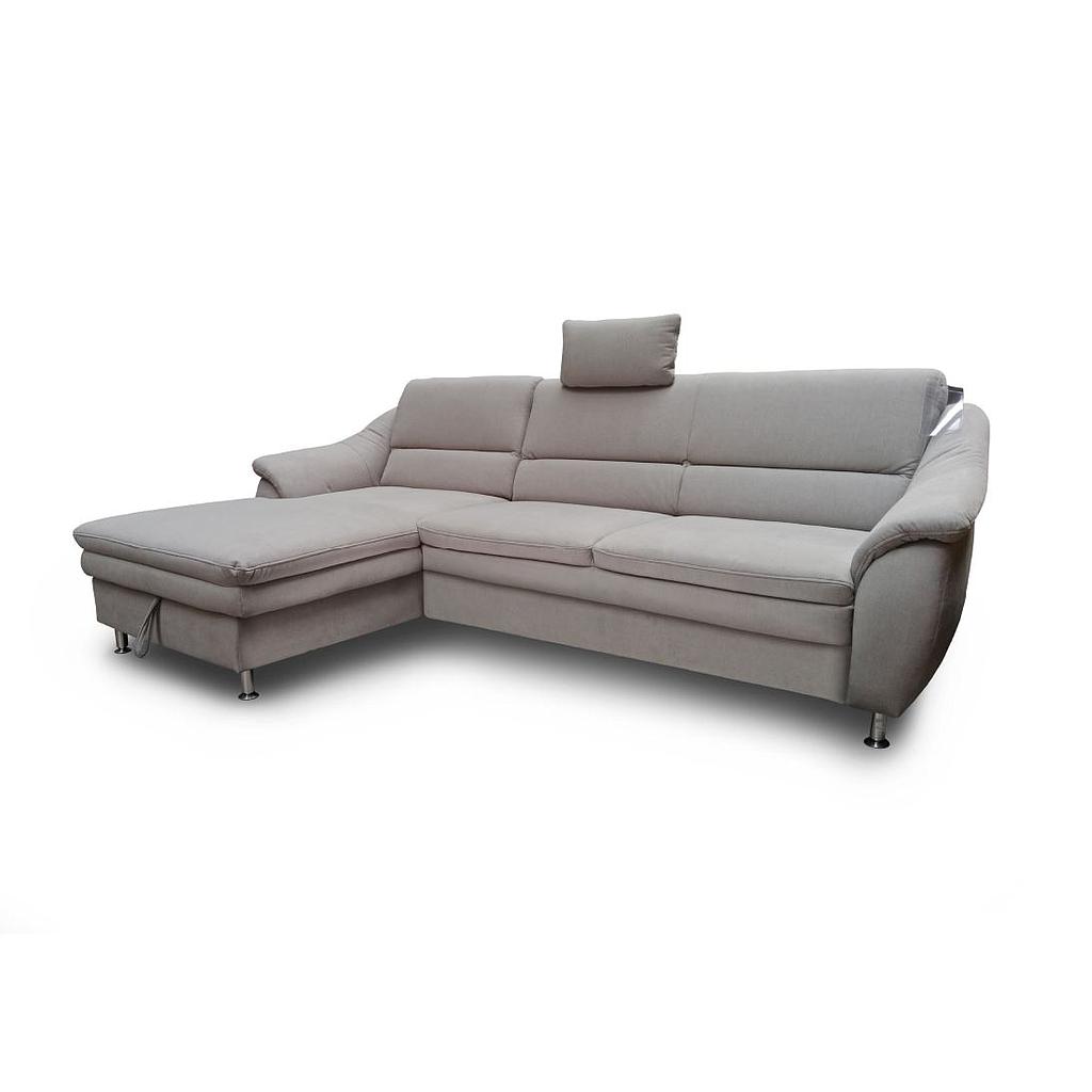 Dora sarokgarnitúra balos,fejtámlával,világos szürke vízzel tisztítható Longlife szövet,ággyal, ágyneműtartóval, 264x90x162 cm