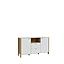 Ez a komód egy praktikus és modern bútordarab, mely világosszürke felületet és Mauvella tölgy utánzattal kombinálva rendelkezik, továbbá alumínium színű fém fogantyúkkal van ellátva. Két faajtó található rajta, mindkettő mögött polccal, ami ideális tárolóhelyet biztosít különböző tárgyaknak vagy dekorációknak.