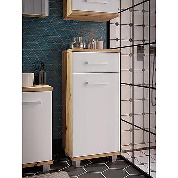 A Feris fürdőszoba bútor készlet megnyerő fa hatást kölcsönöz és elegendő tárolóhelyet biztosít a kozmetikumoknak, személyes ápolási termékeknek, tisztítószereknek vagy törölközőknek a fürdőszobában. A Feris 5 részes fürdőszoba bútor kombináció tartalmaz egy szekrényt, egy komódot, egy mosdós szekrényt és két faliszekrényt. Egyik faliszekrény praktikus tükörrel és világítással van ellátva. A Feris fürdőszoba bútor készlettel modern bútorokat vihetsz a lakásodba, amelyek kellemes hangulatot teremtenek a fürdőszobádban.