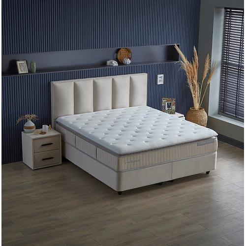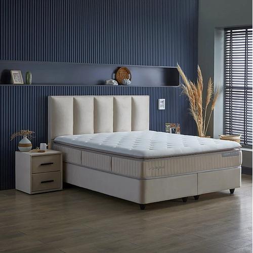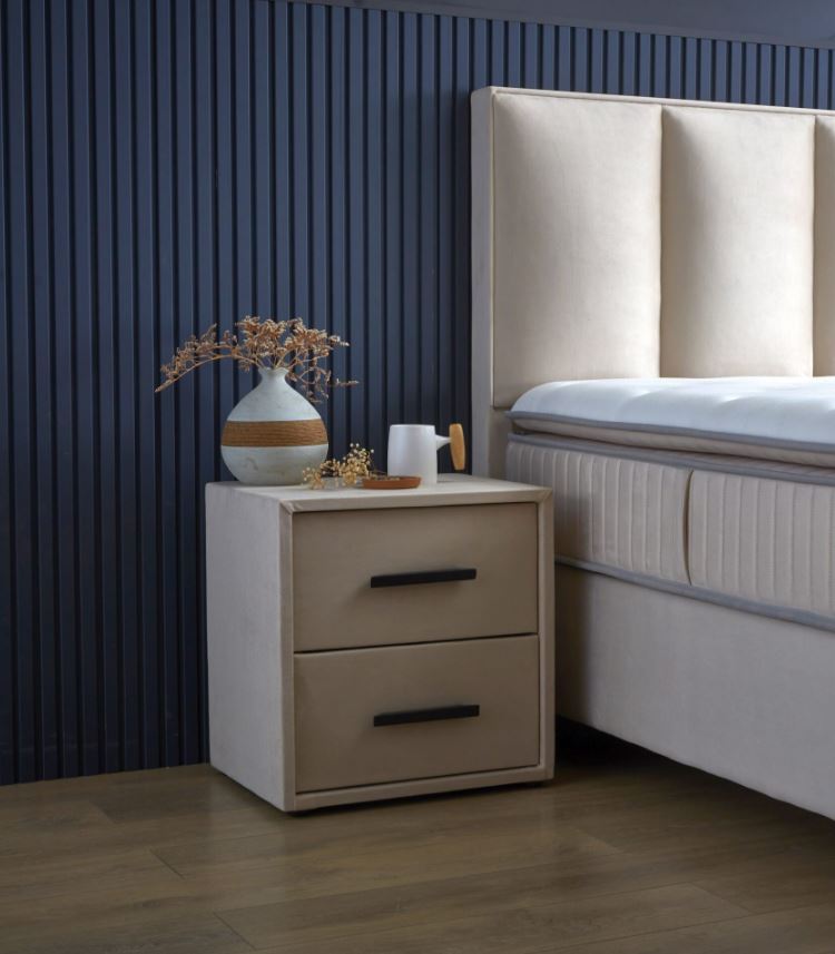 A Kolibri 2 fiókos éjjeli szekrény modern beige szövetborításával tökéletesen harmonizál a hozzá tartozó prémium Kolibri boxspring ágy szövetével – de önálló darabként is megállja a helyét bármilyen modern hálószobában.