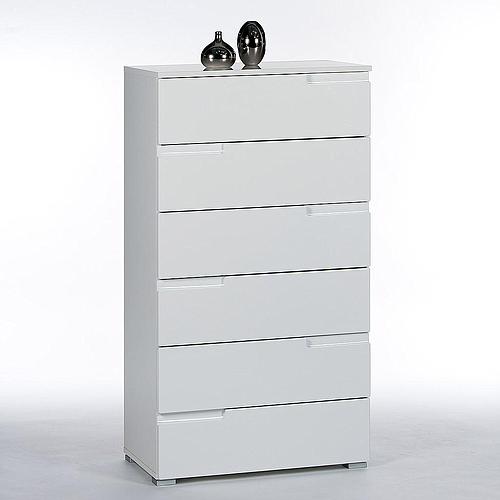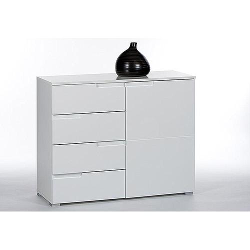 Fehér TV-állvány magasfényű fehér fronntal, 2 ajtóval1 fiókkal, valamint egy nyitott fakkal.