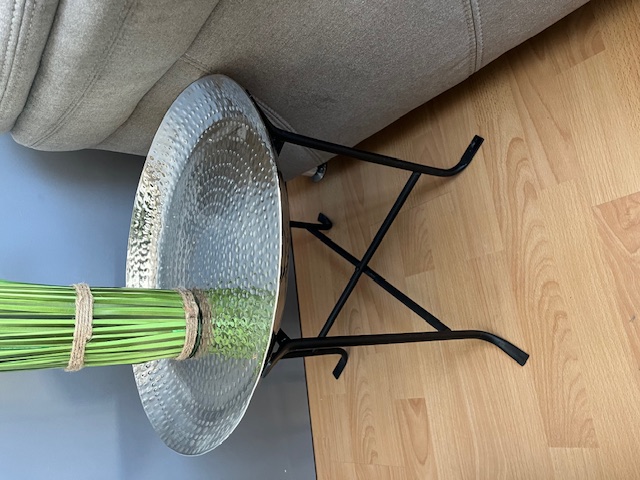 Lerakóasztal, ezüst tálcalappal, fekete lábbal.